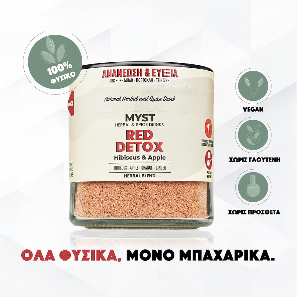 RED DETOX είναι ένα ζωηρό, φρουτοβότανο ρόφημα με ιβίσκο, μήλο και πορτοκάλι. Με το λαμπερό κόκκινο χρώμα του και τη δροσιστική του γεύση, αποτελεί μια ανάλαφρη, αναζωογονητική επιλογή καθημερινής ενυδάτωσης. Ιδανικό για wellness ρουτίνες, ζεστές ημέρες ή ως φυσικό φρουτώδες ρόφημα που χαρίζει ισορροπία και φρεσκάδα όλη μέρα.