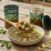 Ingredienser: Gröna oliver, vatten, extra jungfruolivolja, salt, vinäger, citronsaft, oregano.
