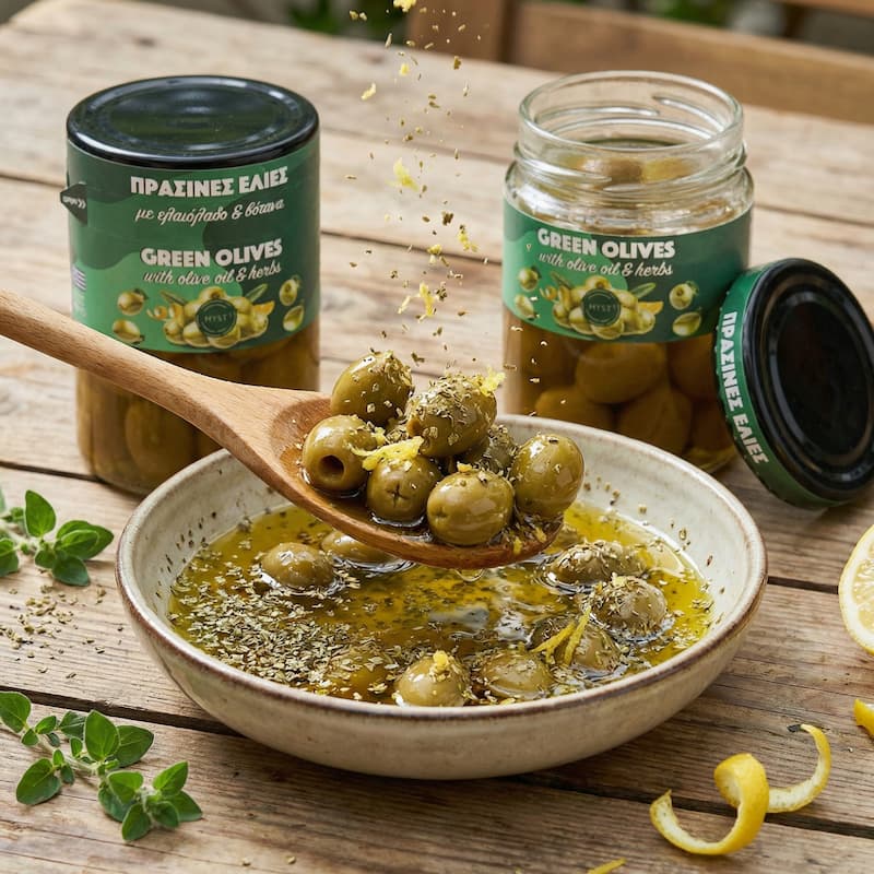 Våra gröna oliver handplockas och mognar naturligt i havssalt i sex månader. Därefter marineras de i extra jungfruolivolja, vinäger, citronsaft och oregano – en smakrik och autentisk upplevelse från Grekland.